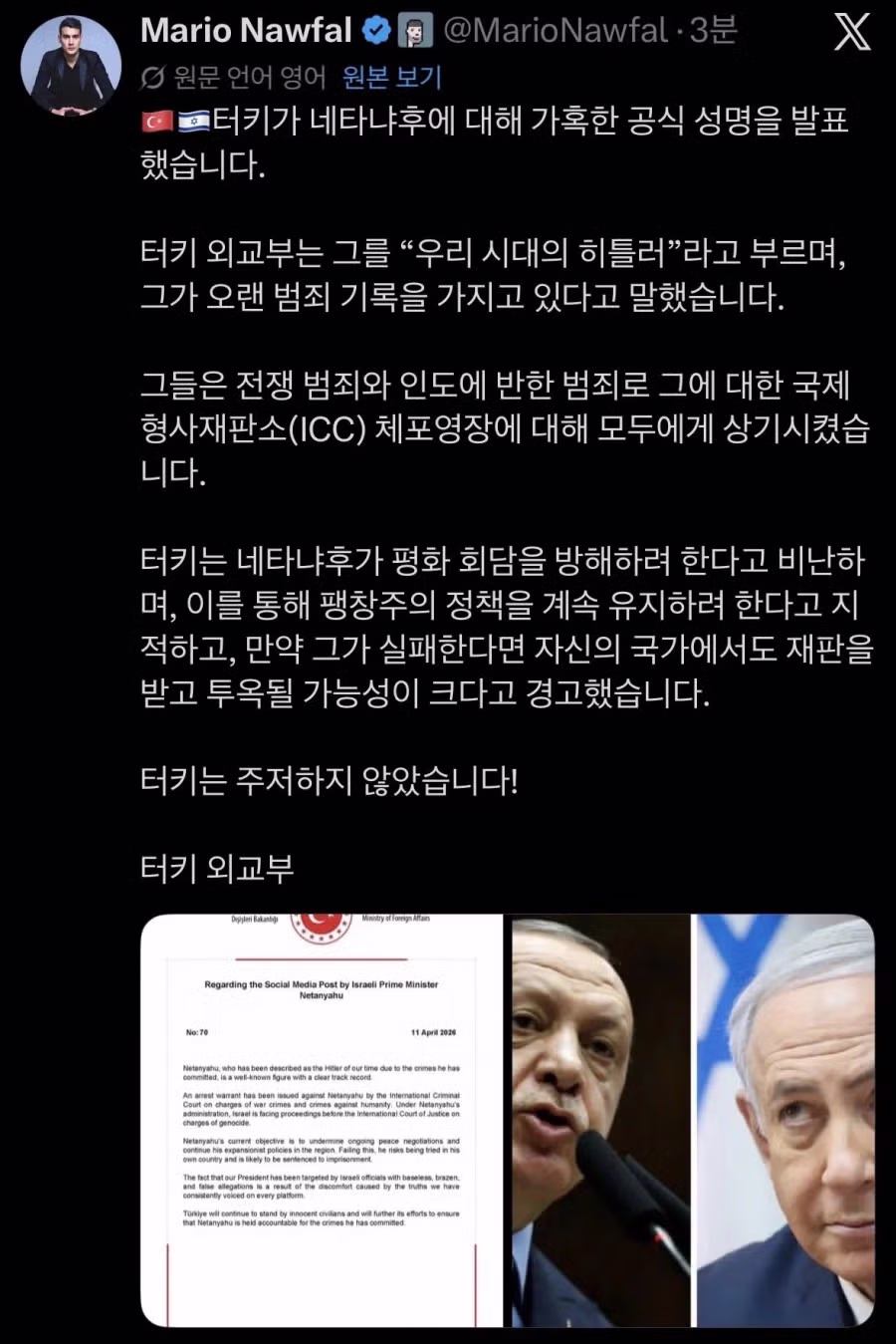 [속보] 튀르키예, "네타냐후는 히틀러"