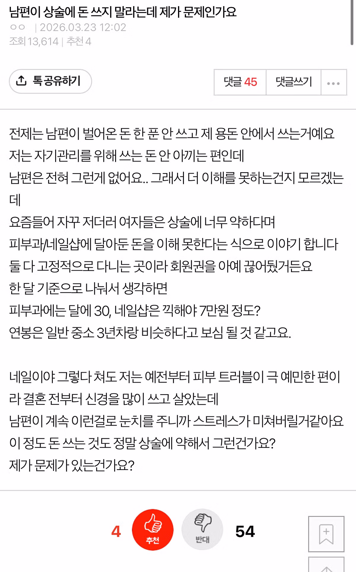 남편이 상술에 돈 쓰지 말라는데 제가 문제인가요