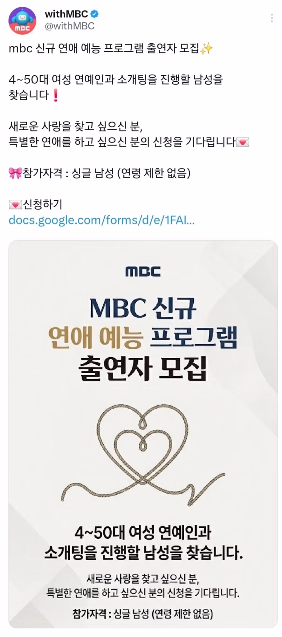 MBC : 4050 여자 연예인과 소개팅 할 남자 모집합니다