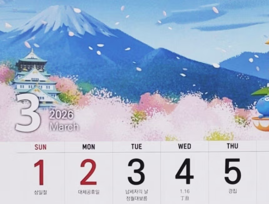‘삼일절’ 있는 3월 달력인데 후지산 오사카성이라니…금융기관 달력 논란