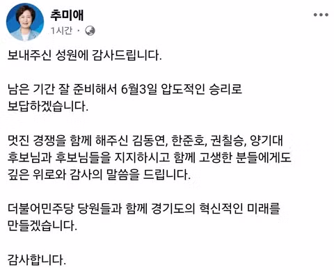 추미애가 되었어요? 김동연 꼴 보기 싫었는데 잘 되었네요. 추미애 후보님 응원합니다. 행정은 다를텐데 그래도 진정성 있는 분이니 잘해주시리가 믿어봅니다.