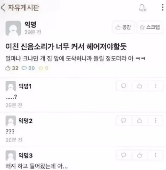 여친 신음소리가 너무 커서 헤어진다는 어느 글쓴이