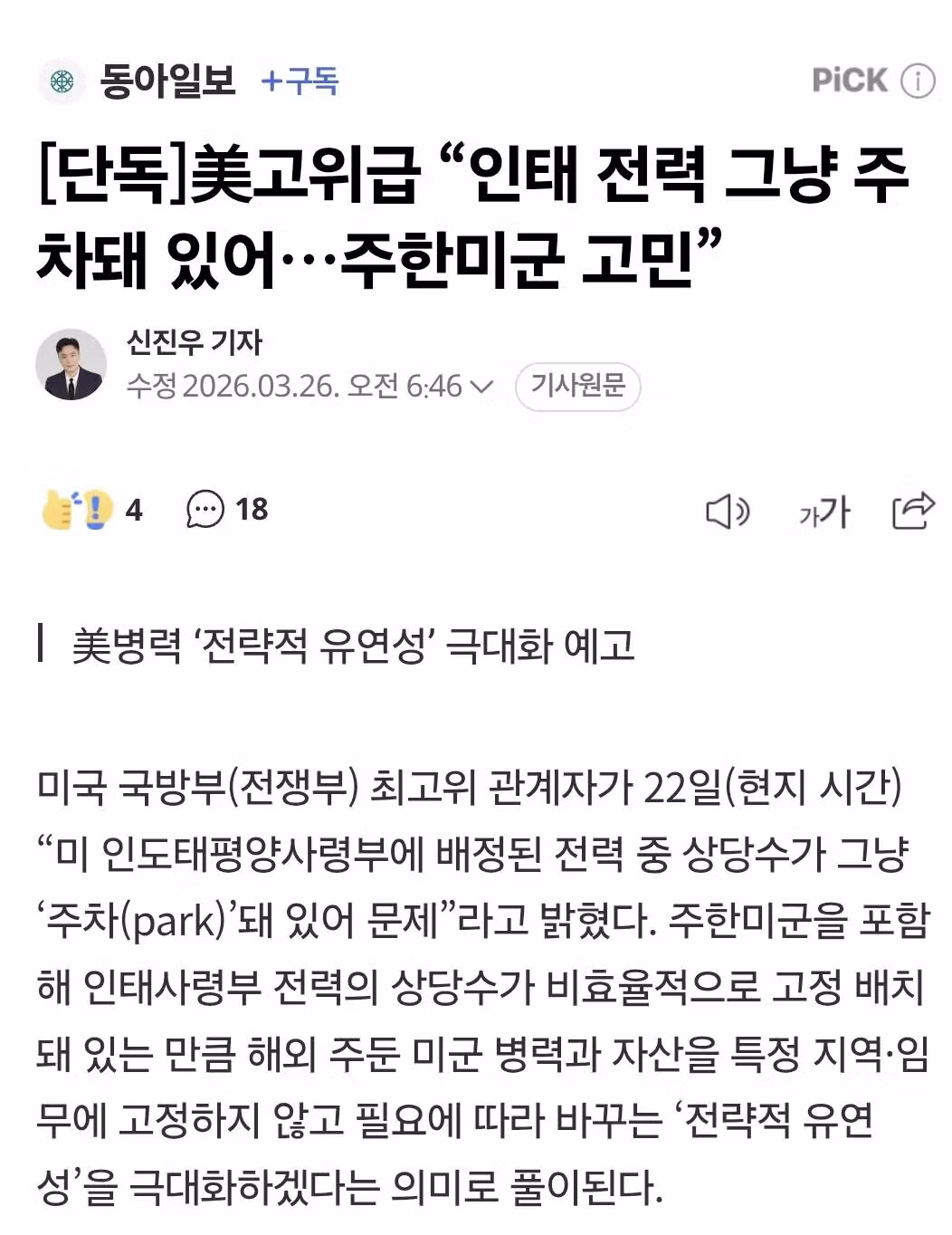 미국 ' 주한미군이 굳이 한국에 고정될 이유는 없다 '