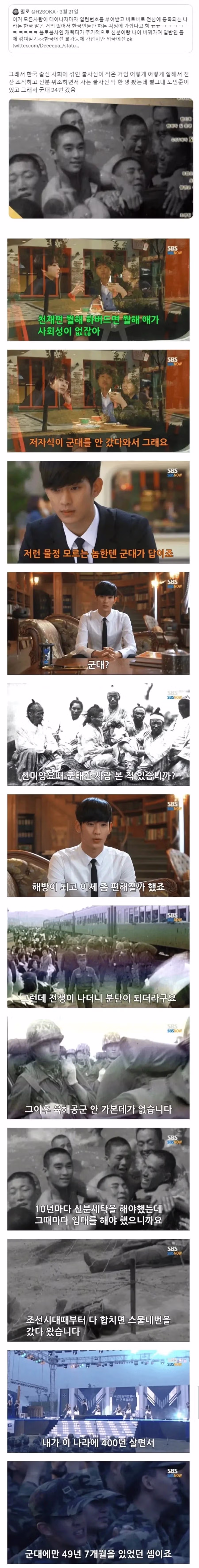 남한이라 그나마 다행이지 북한이었으면 복무기간 10년이라 그냥 해방하고 70년동안 군대에 쭉 있을뻔 했네