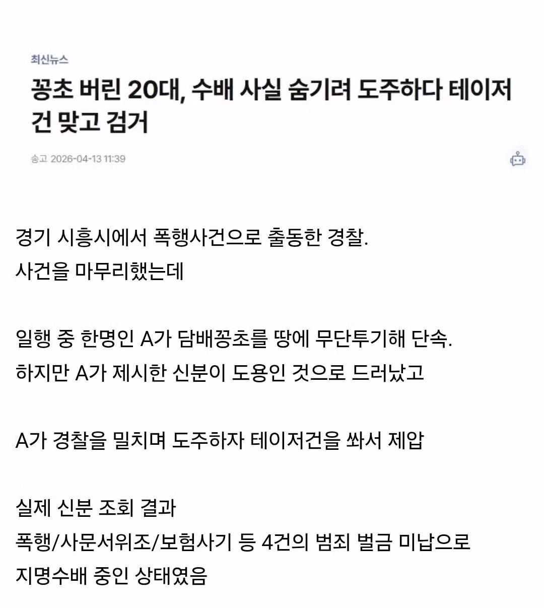 담배꽁초 버렸다가 테이저건 맞은 20대