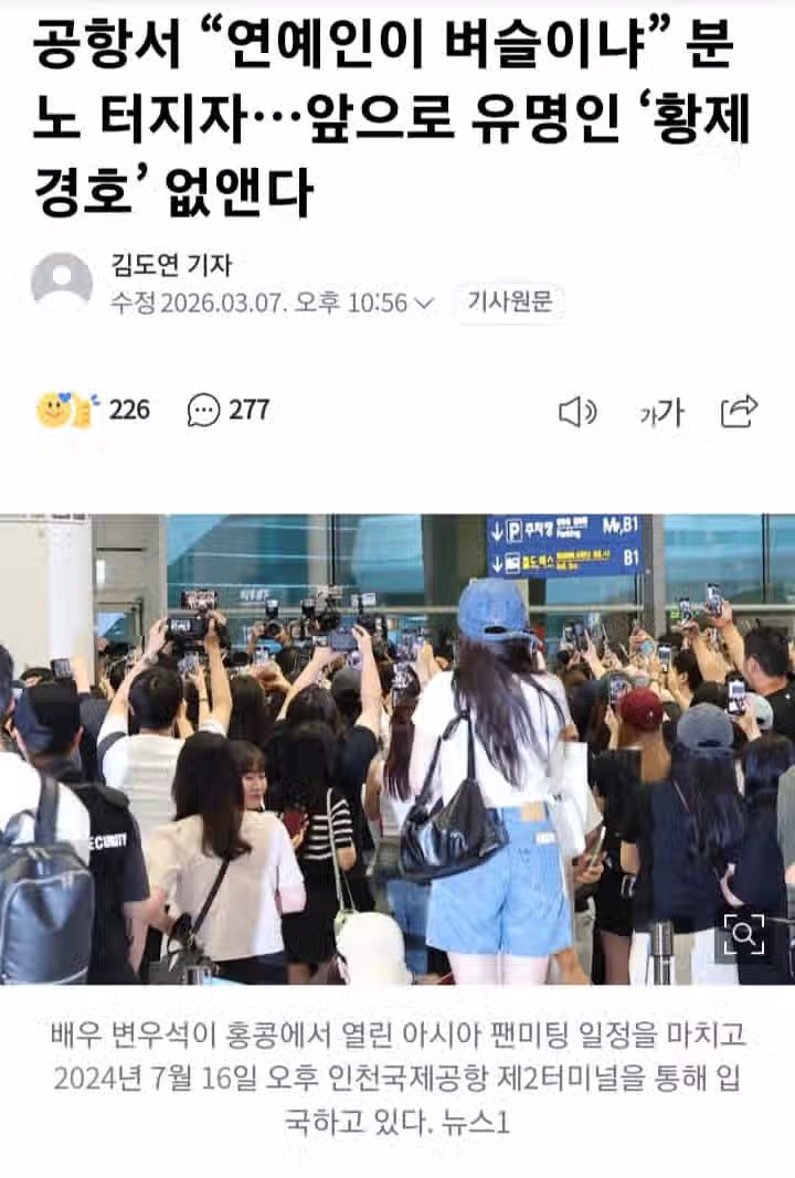 공항서 “연예인이 벼슬이냐” 분노 터지자…앞으로 유명인 ‘황제 경호’ 없앤다