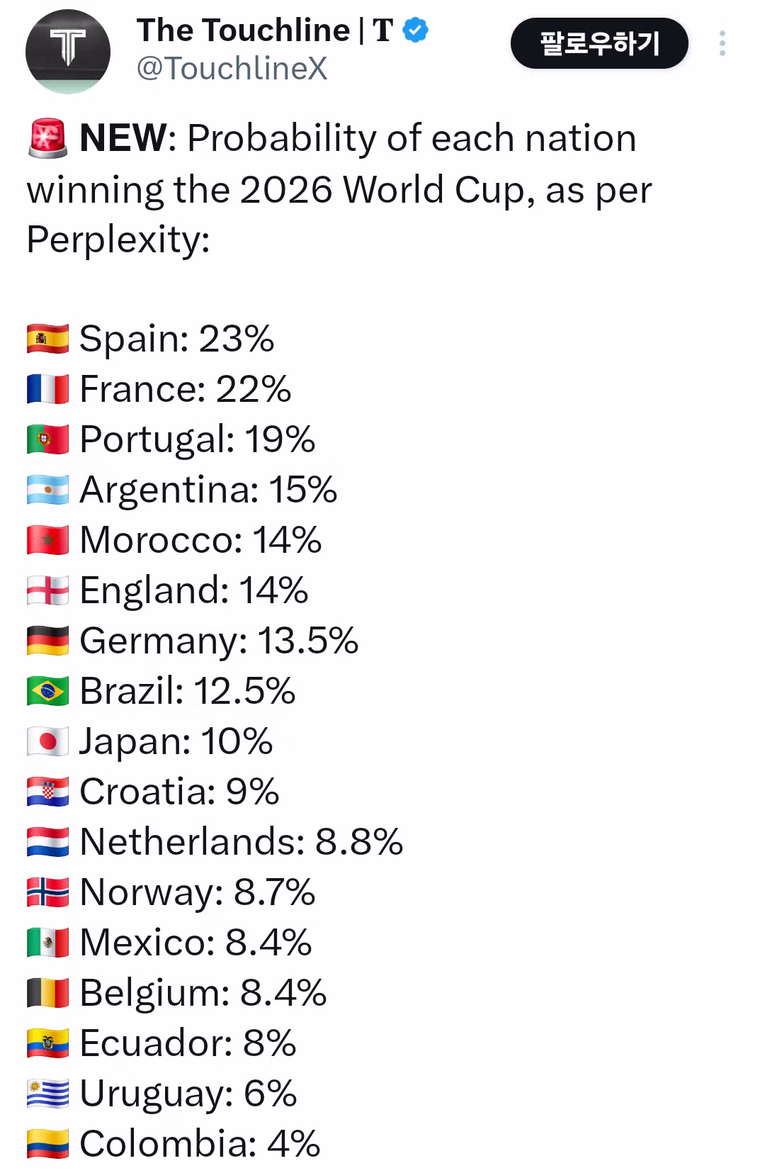 미국 AI 퍼플렉시티가 분석한 나라별 2026월드컵 우승 확률.jpg