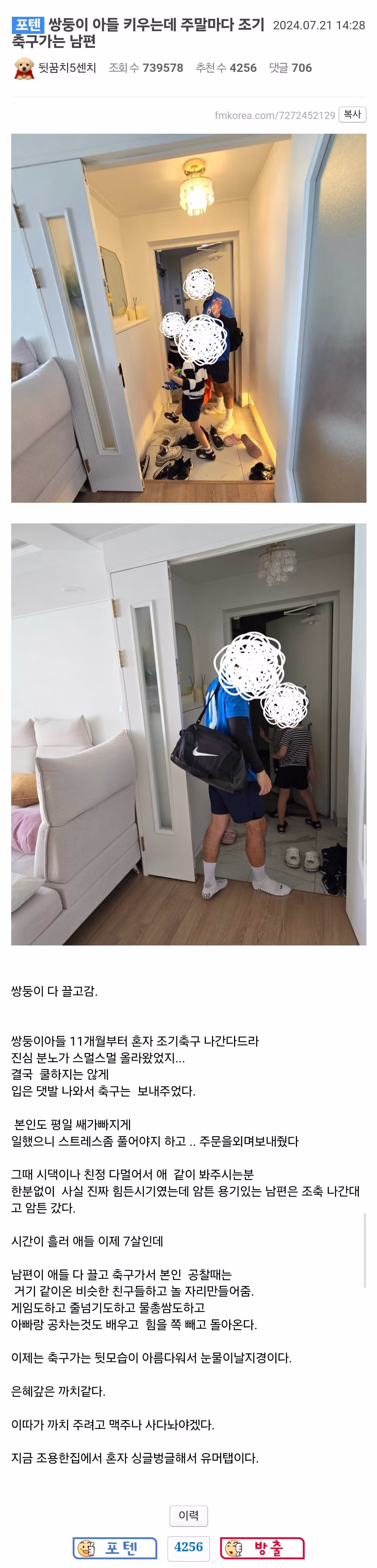 장투) 쌍둥이 아들 키우는데 남편이 주말마다 조기축구 나가요