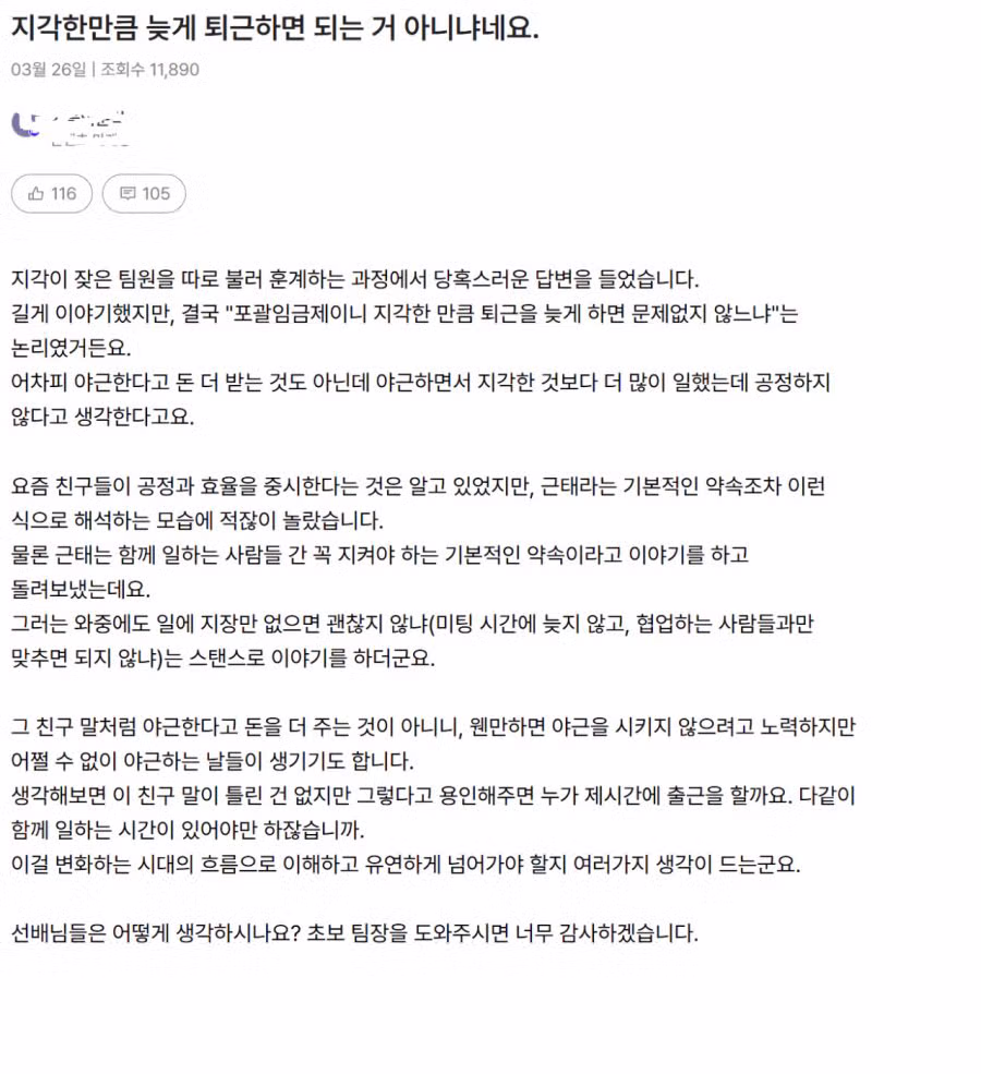 지각한만큼 늦게 퇴근하면 되지 않냐는 팀원 논란 ㄷㄷㄷㄷㄷㄷㄷㄷㄷㄷㄷㄷㄷ