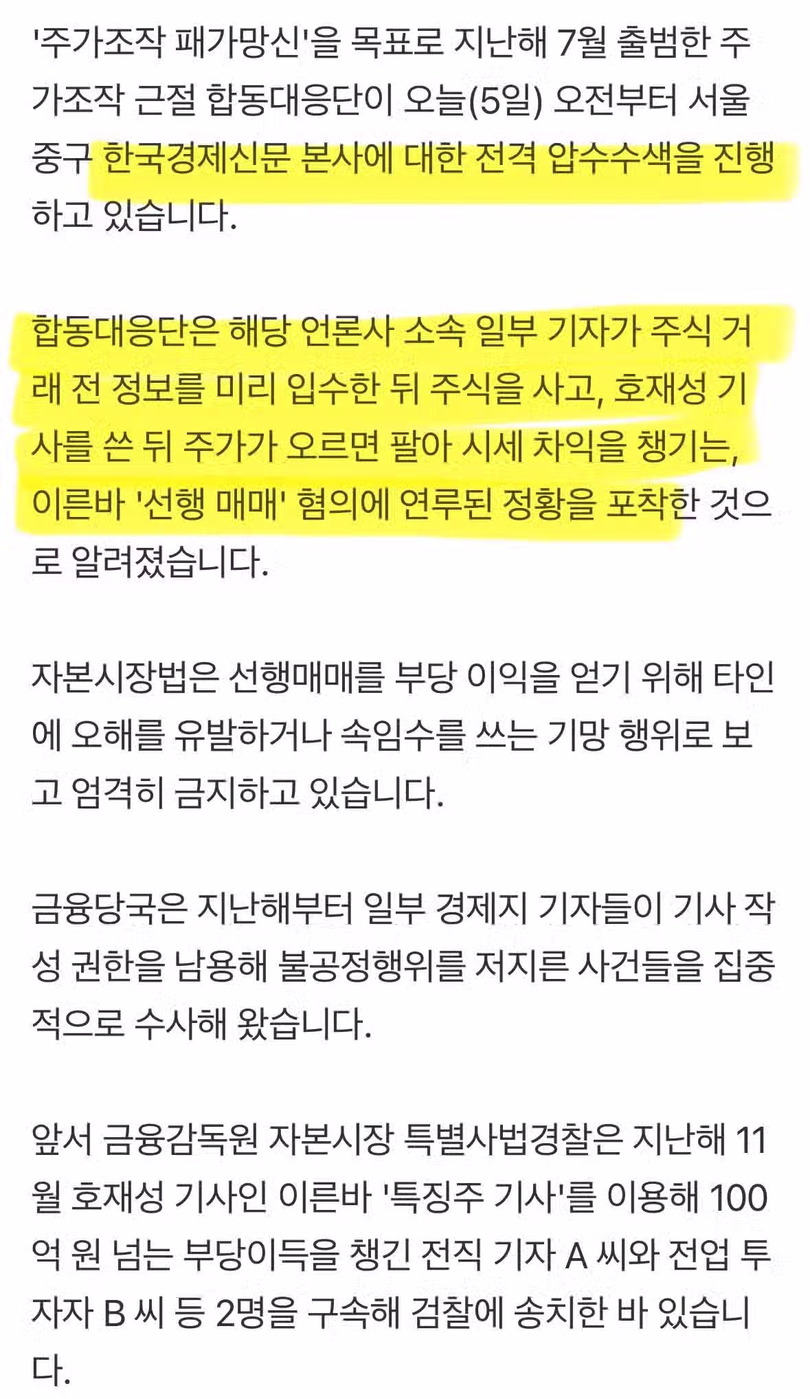 주가조작 대응단, 한국경제신문 압수수색…기자 선행 매매 혐의