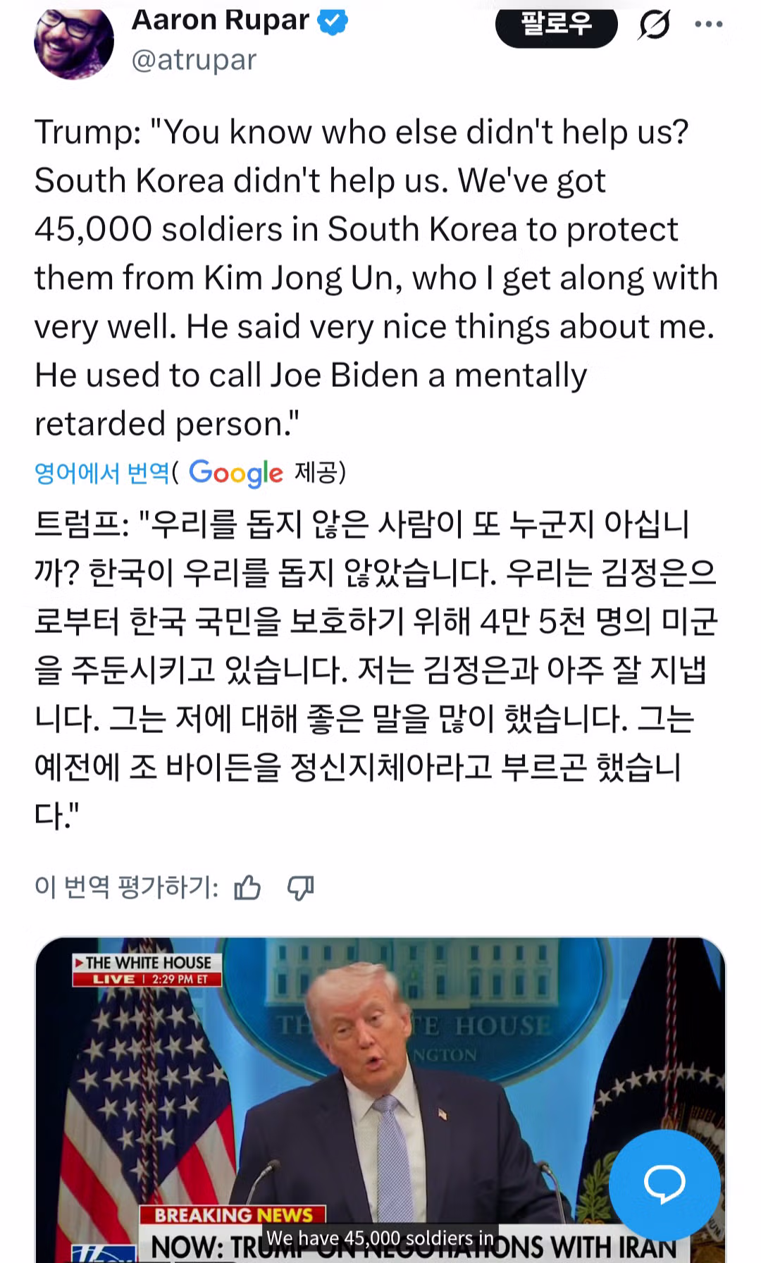 트럼프 : 한국은 우릴 돕지않았지만 김정은은 나랑 친하다!!!!!