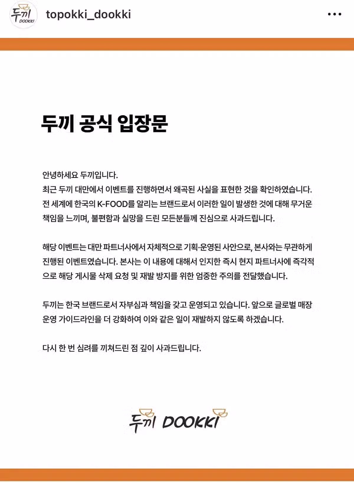 두끼 대만점 혐한 논란 공식 입장문 발표