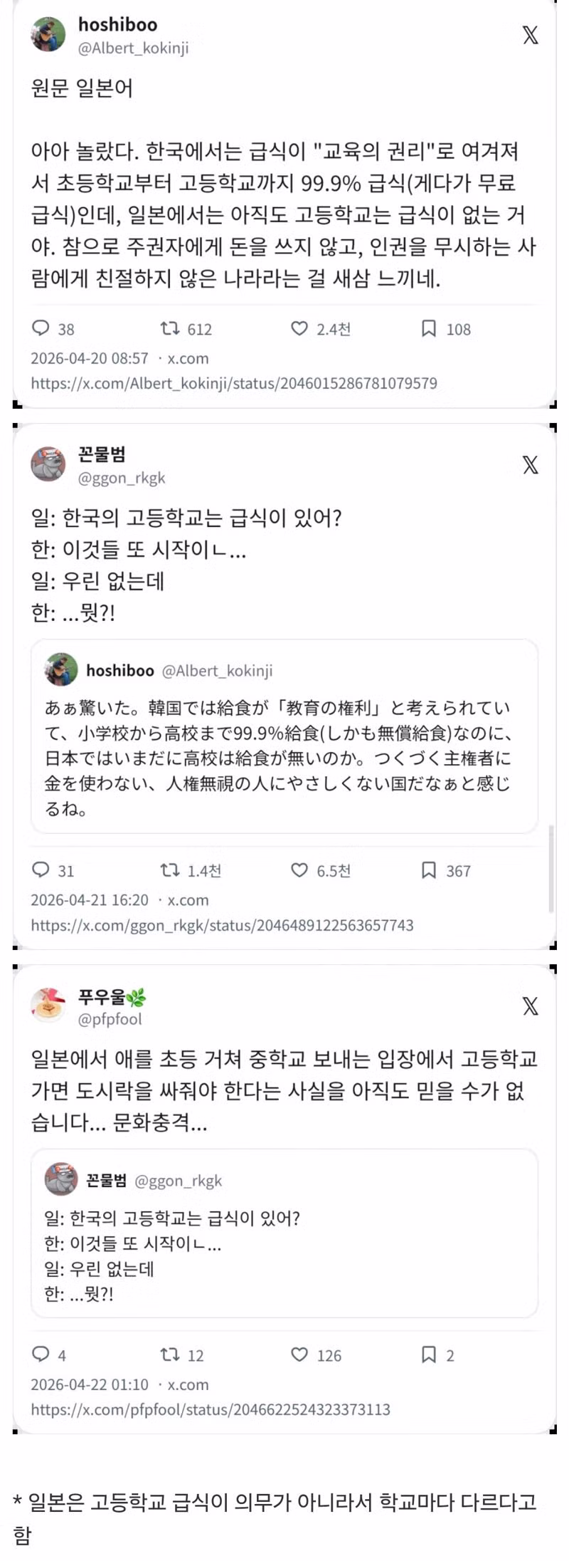 일본인 “한국의 고등학교에는 급식이 있습니까”
