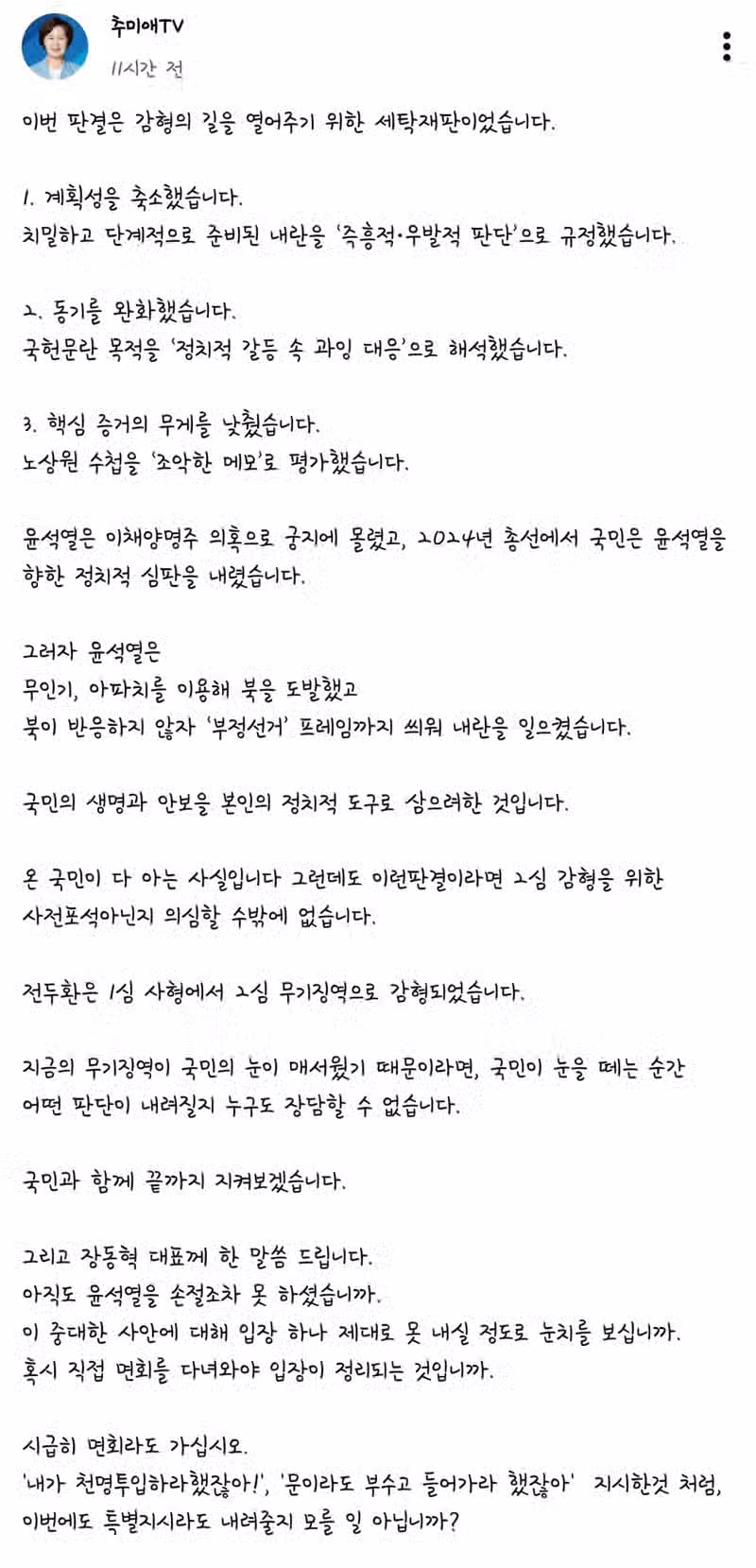 이번 판결은 감형의 길을 열어주기 위한 세탁재판이였습니다 -추미애-