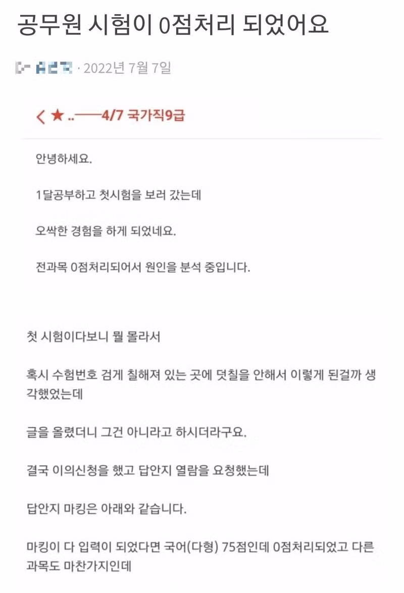공무원 시험 0점 처리된 사람