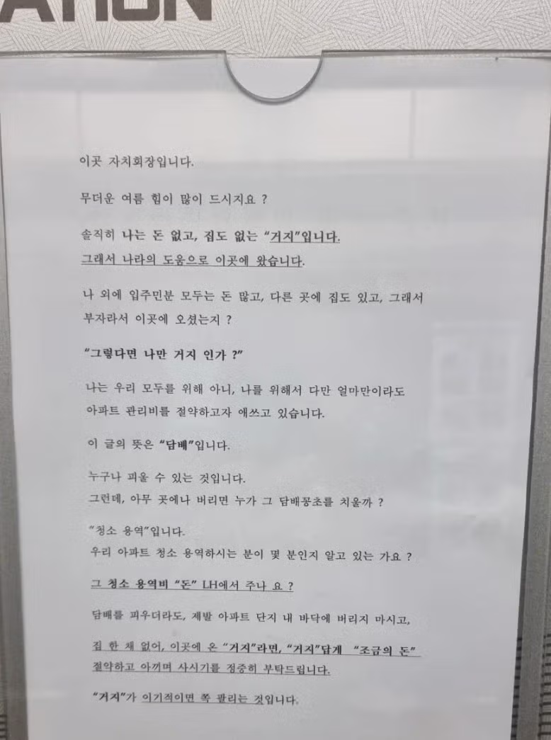 "거지면 거지답게 아끼며 살자"…임대 아파트에 붙은 자치회장 안내문