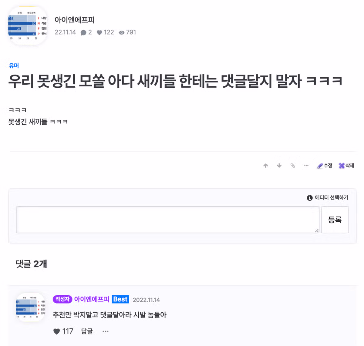 우리 못생긴 모쏠 아다 새끼들한테는 댓글 달지 말자ㅋㅋㅋ