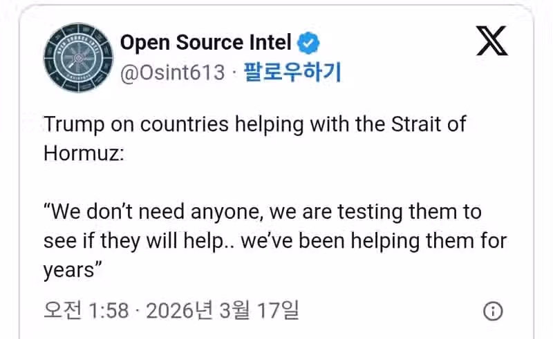트럼프. 호르무즈 해협 문제 협조 국가들 언급.