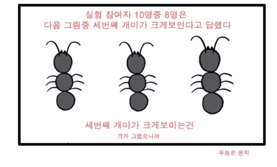 10명중 8명은 한쪽 개미가 커보인다고 하였다