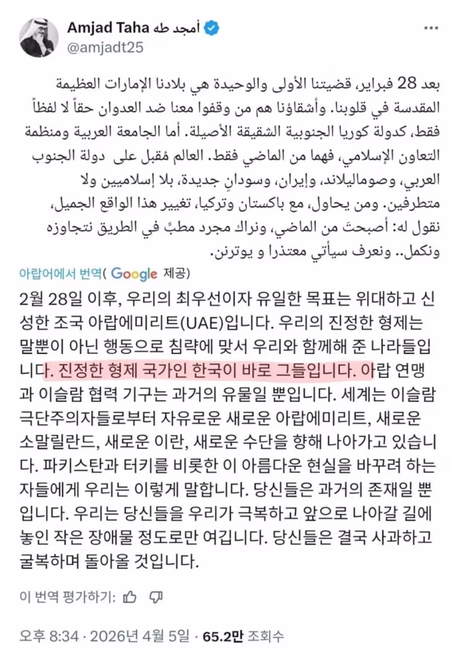 UAE 유명 정치 평론가 : 우리의 형제 국가는 한국