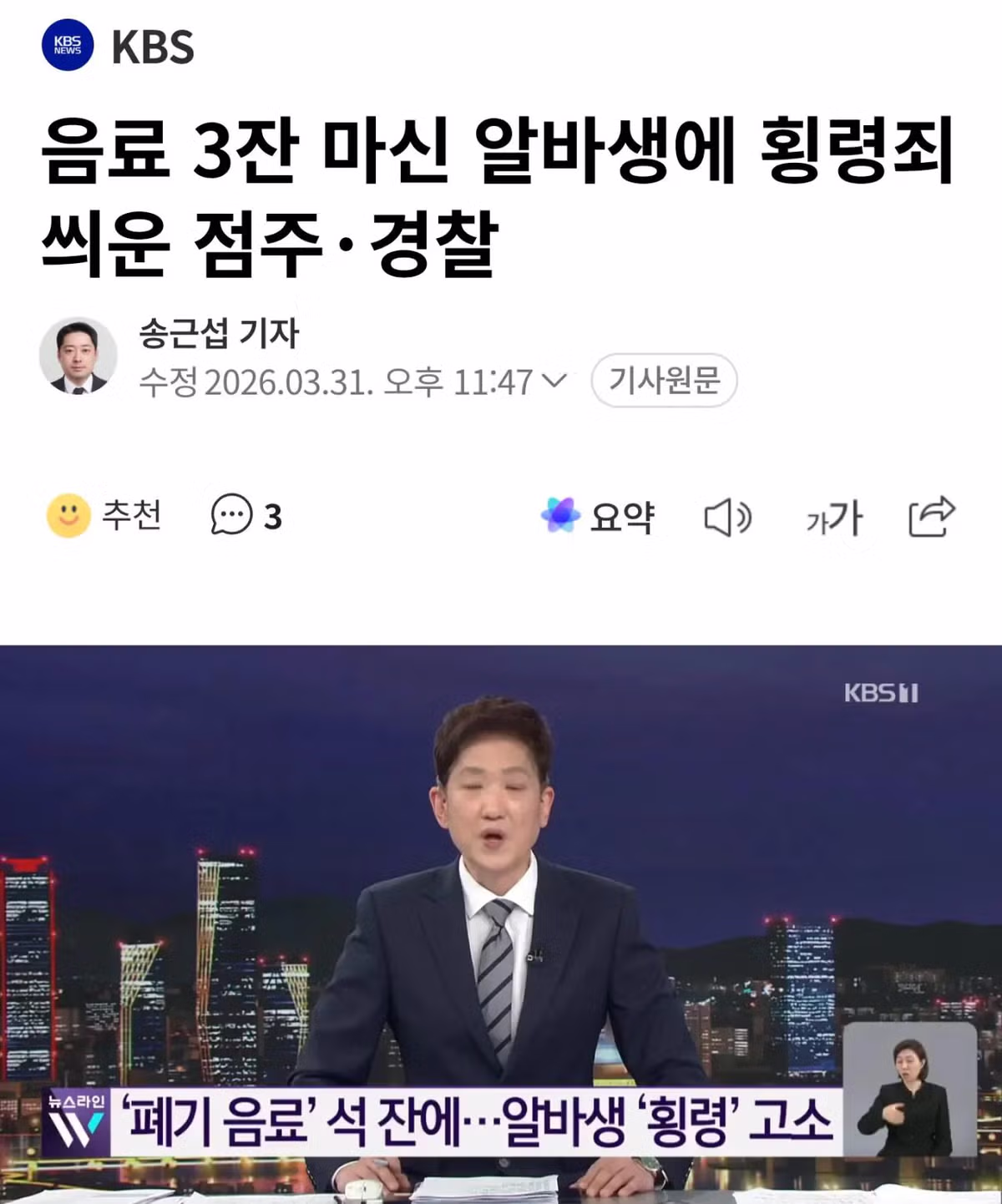 음료 3잔 마신 알바생에게 횡령죄 씌운 점주, 경찰