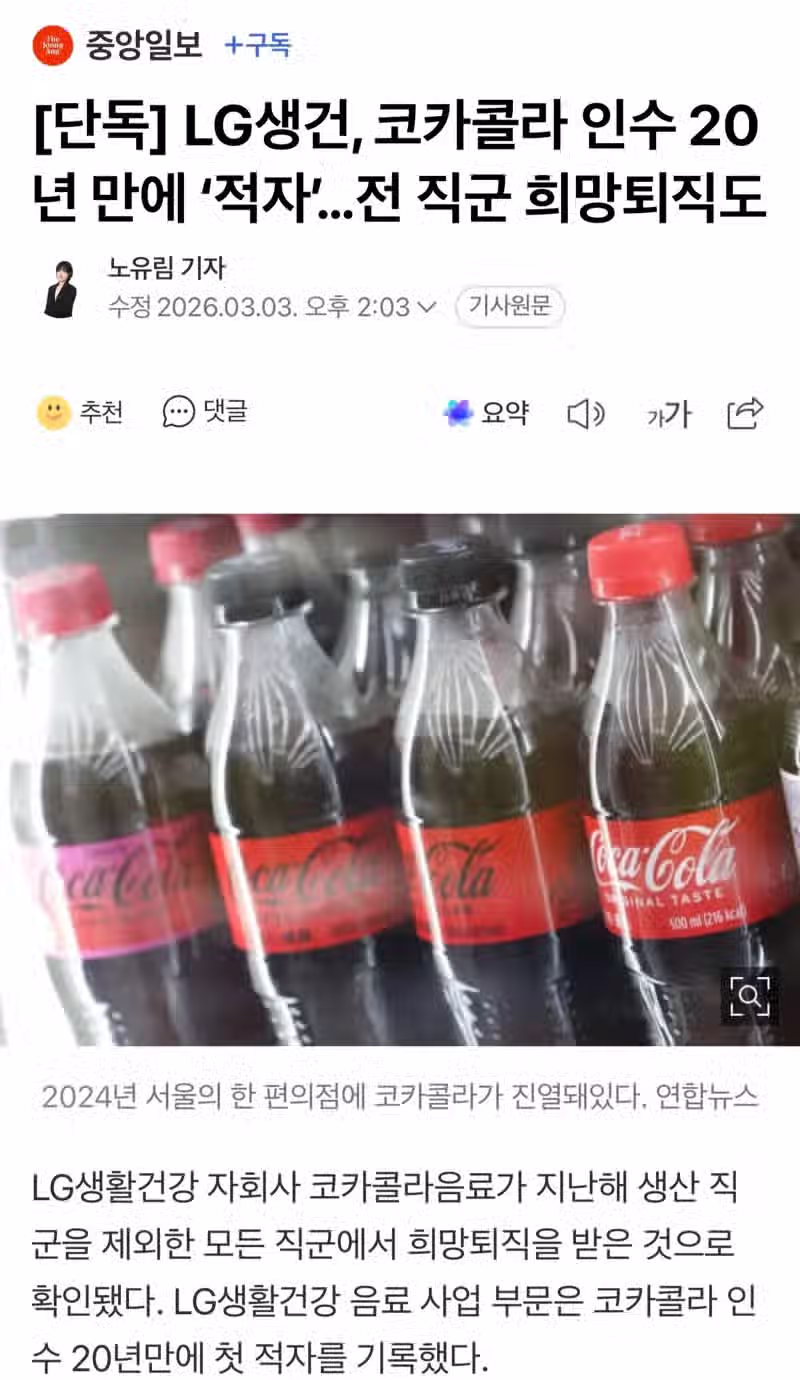 [단독] LG생건, 코카콜라 인수 20년 만에 ‘적자’…전 직군 희망퇴직도