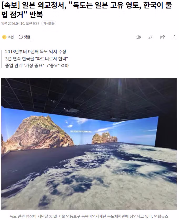 [속보] 일본 외교청서, "독도는 일본 고유 영토, 한국이 불법 점거" 반복