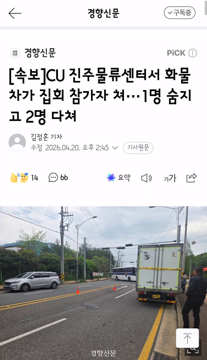 CU 진주물류센터서 화물차가 집회 참가자 쳐···1명 숨지고 2명 다쳐