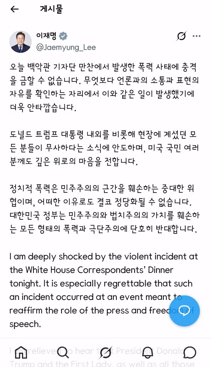 이재명 대통령의 만찬장 폭력 사태에 위로와 연대메세지 - 밈카세