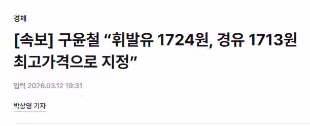 속보) '휘발유 1724원, 경유 1713원 최고가격으로 지정'