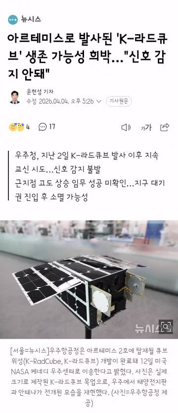 아르테미스로 발사된 'K-라드큐브' 생존 가능성 희박…"신호 감지 안돼"