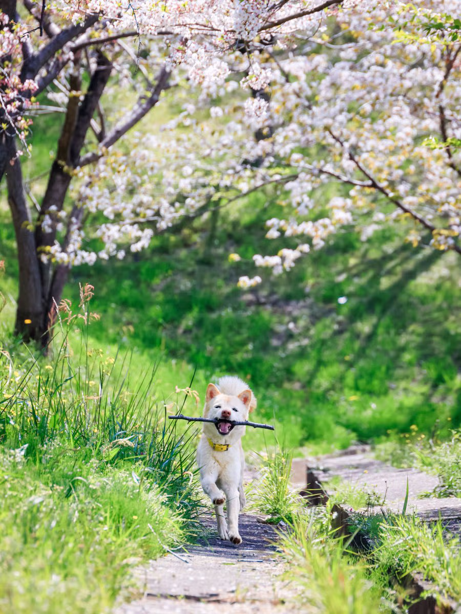 벚꽃나무 아래 행복산책하는 강아지
