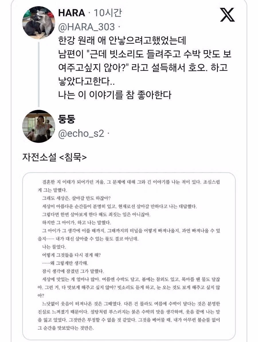 아이 가질 생각 없던 한강의 생각을 바꾼 남편의 한마디