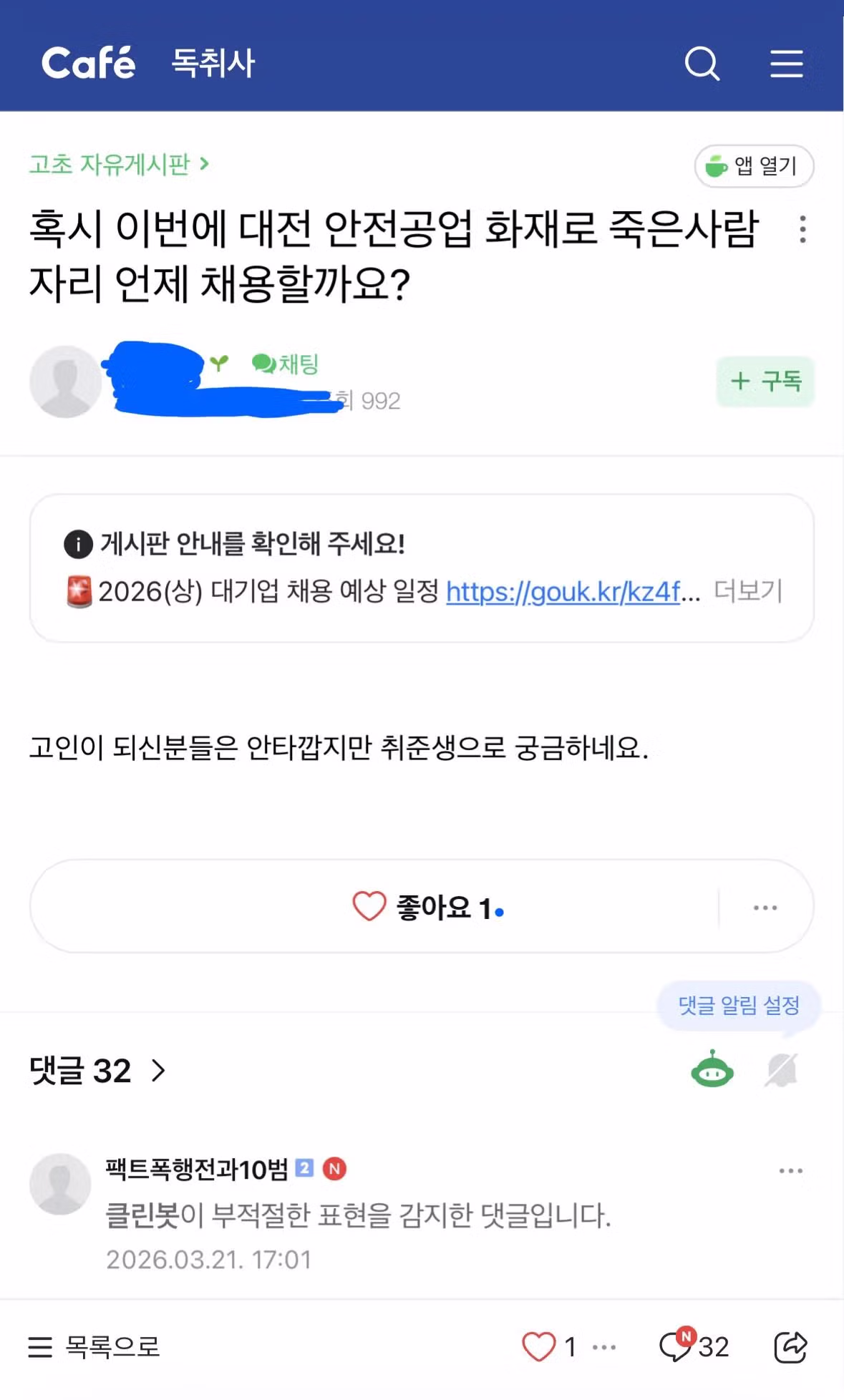 취준생 : 대전 화재로 죽은사람 자리는 언제 채용하나요