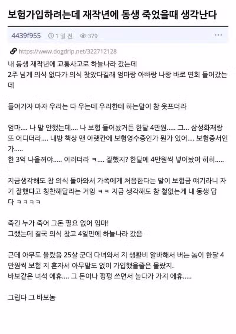 동생이 죽기 직전에 의식 돌아와서 처음 한 말