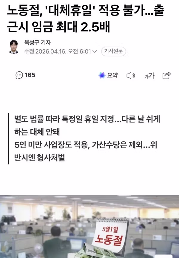 노동절, '대체휴일' 적용 불가…출근시 임금 최대 2.5배