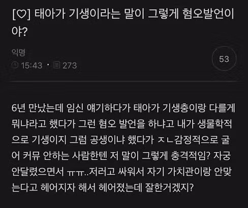 저런 사람이 임신하면 자기애도 기생충이라고 생각할지 궁금하다