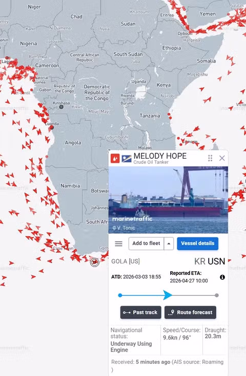 지금 이시간 아프리카 남단을 돌아서 울산으로 오는 유조선