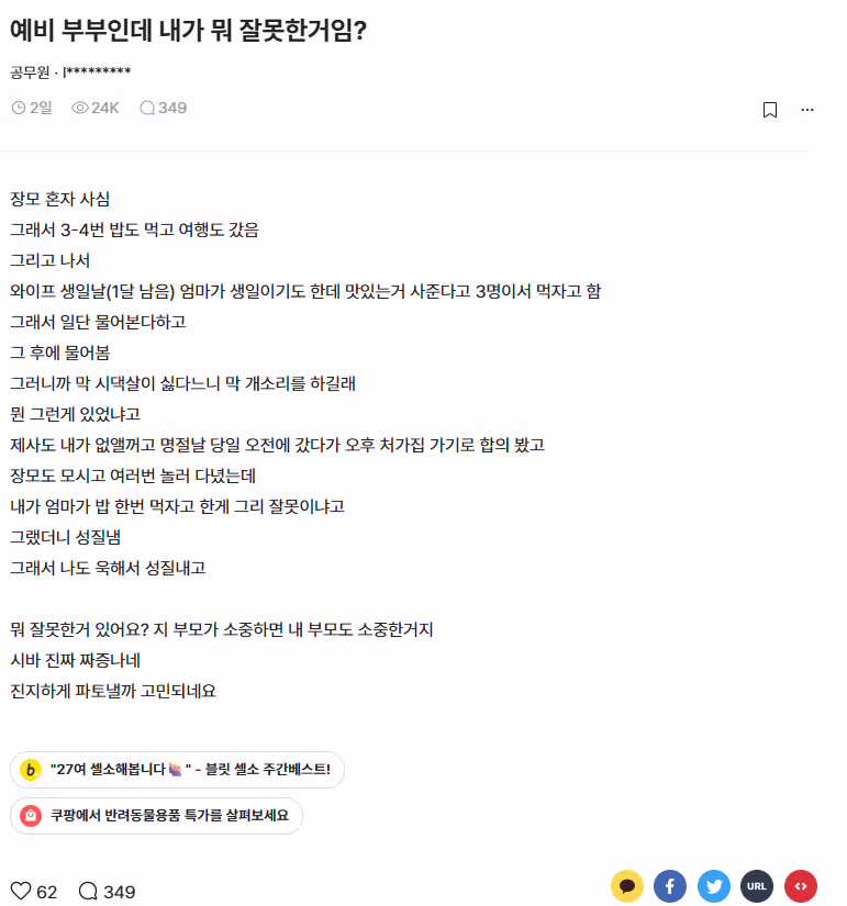 결혼을 했으면 그냥 둘이서 해결해라. 가족들 끼우지 말고.