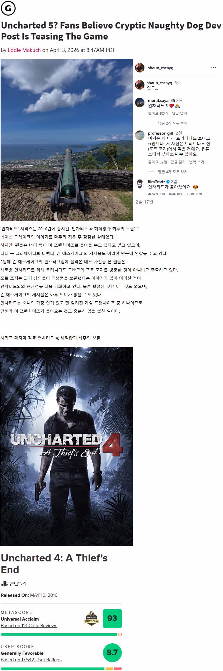 [루머]팬들은 너티 독 개발자의 게시물이 '언차티드 5'를 암시한다고 믿는다.