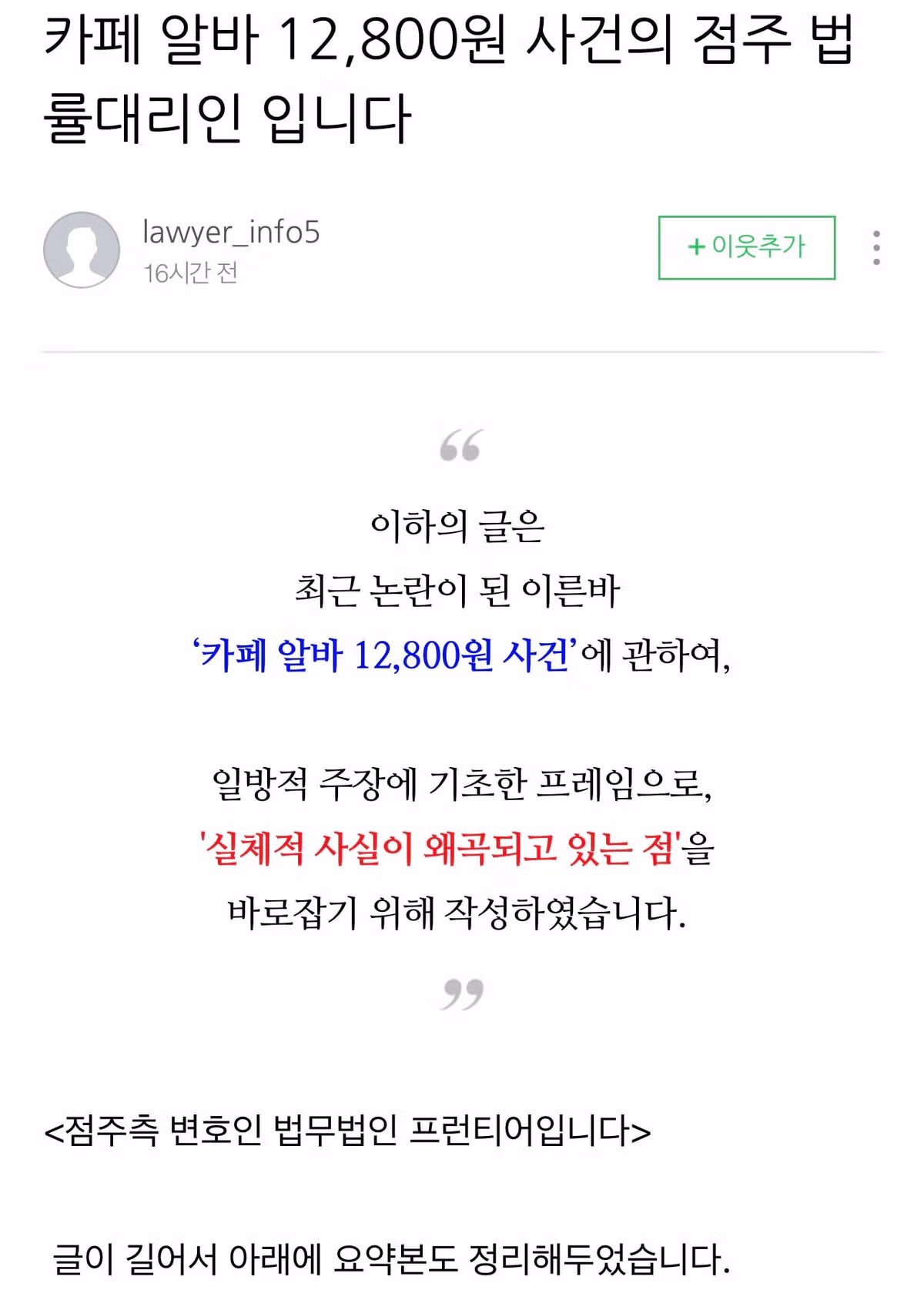 (스압)청주 카페 알바 12,800원 고소 사건 점주측 법률대리인 입장