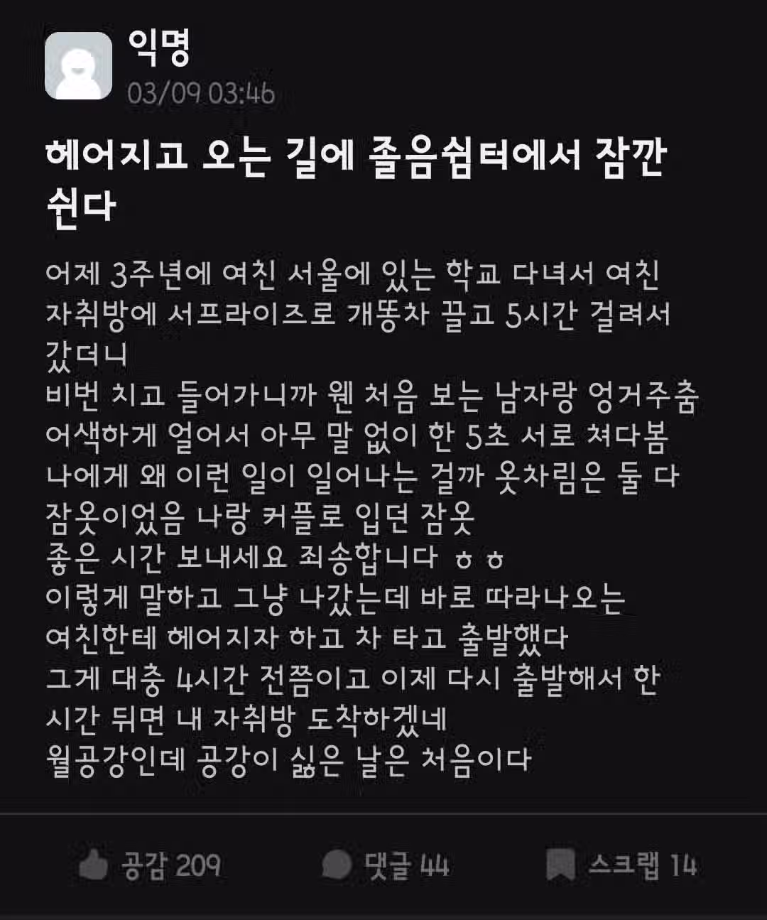 여친 자취방 갔다가 헤어지고 온 대학생.