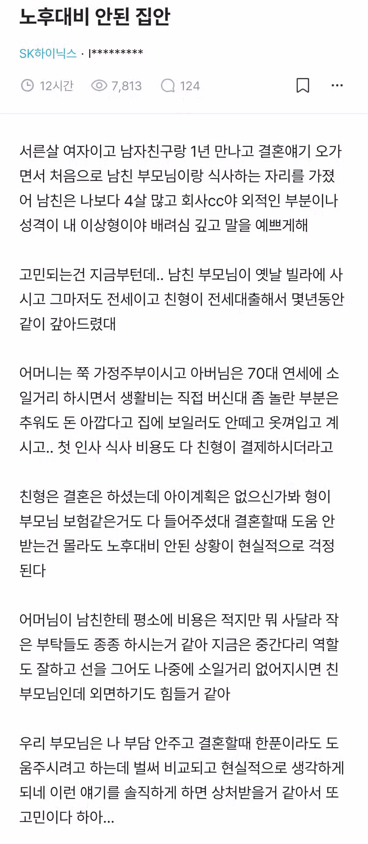 블라) 남친 부모님의 노후 대비가 안되어서 결혼을 망설이는 SK하이닉스 누나