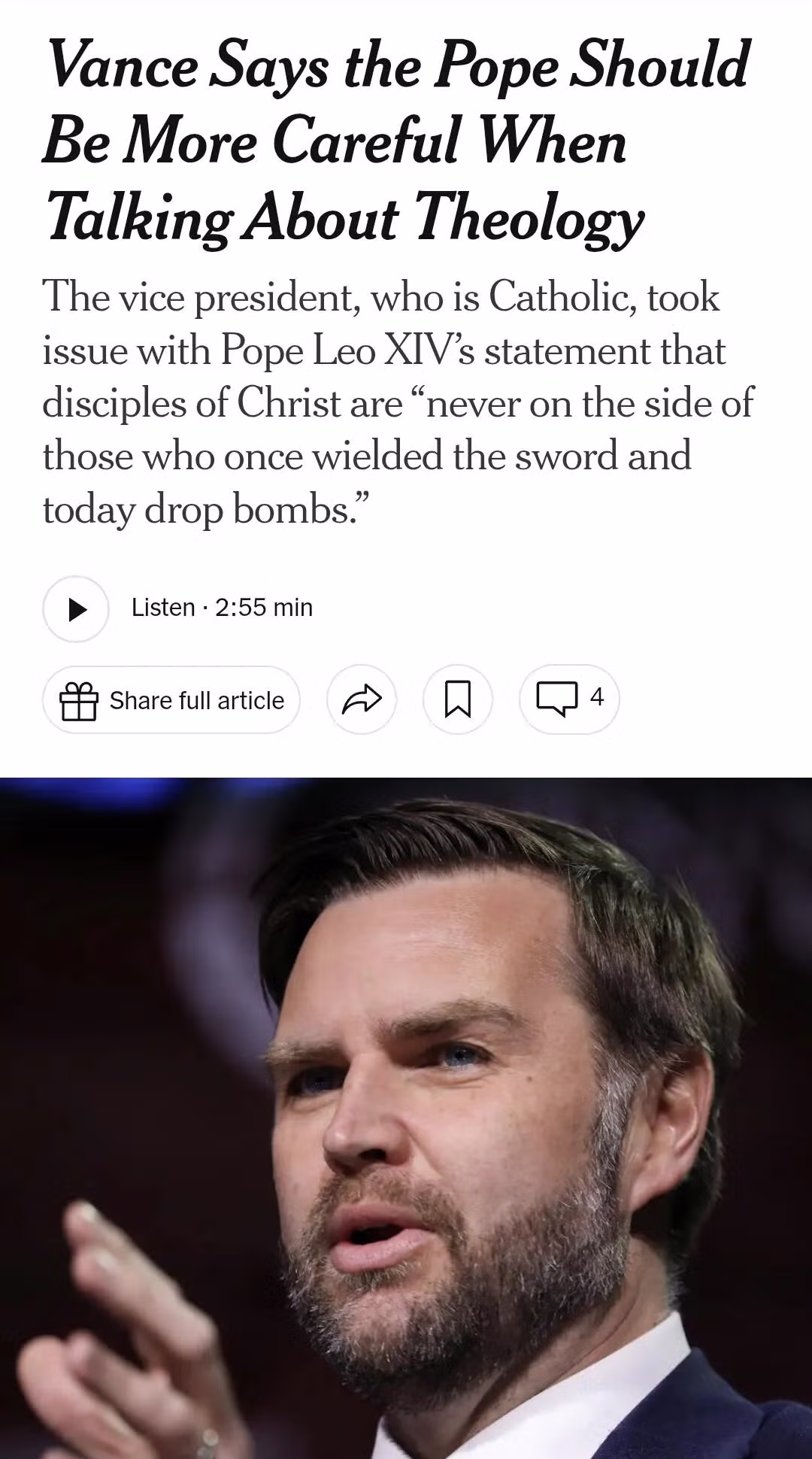 밴스 부통령, "교황은 신학을 논할 때 말을 삼가하도록!"