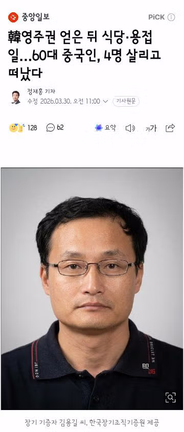 한국서 20년간 나눔 베푼 중국인...4명 살리고 떠나