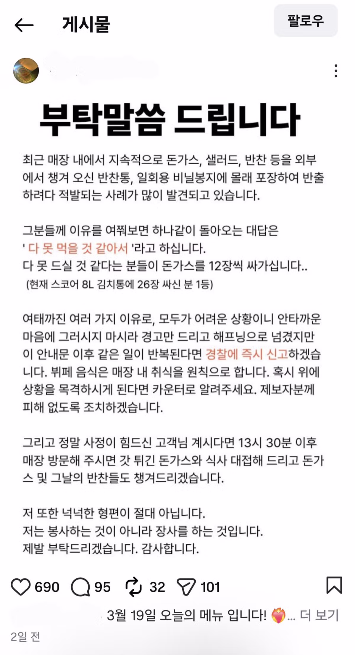무한리필 돈가스 사장님이 남기는 부탁말씀....