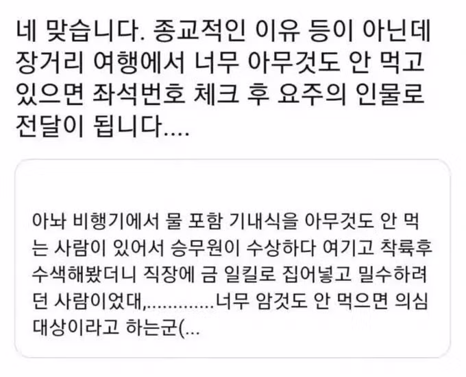 장시간비행에서 계속 굶으면 대장금으로 오해받을 수 있음