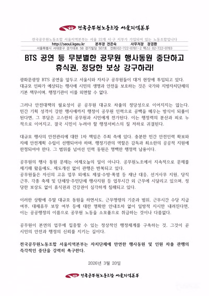 공무원노조 "BTS 공연에 무분별한 동원 중단하라” 성명문77