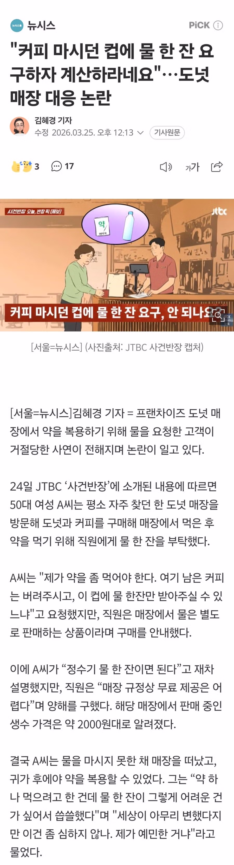 "커피 마시던 컵에 물 한 잔 요구하자 계산하라네요"…도넛 매장 대응 논란.gisa