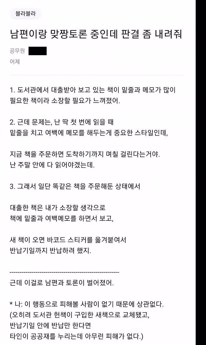 근데 남편이랑 저렇게 병림픽할동안 도서관에 전화해서 사정얘기하고 허가받으면 더 마음편하지 않냐??